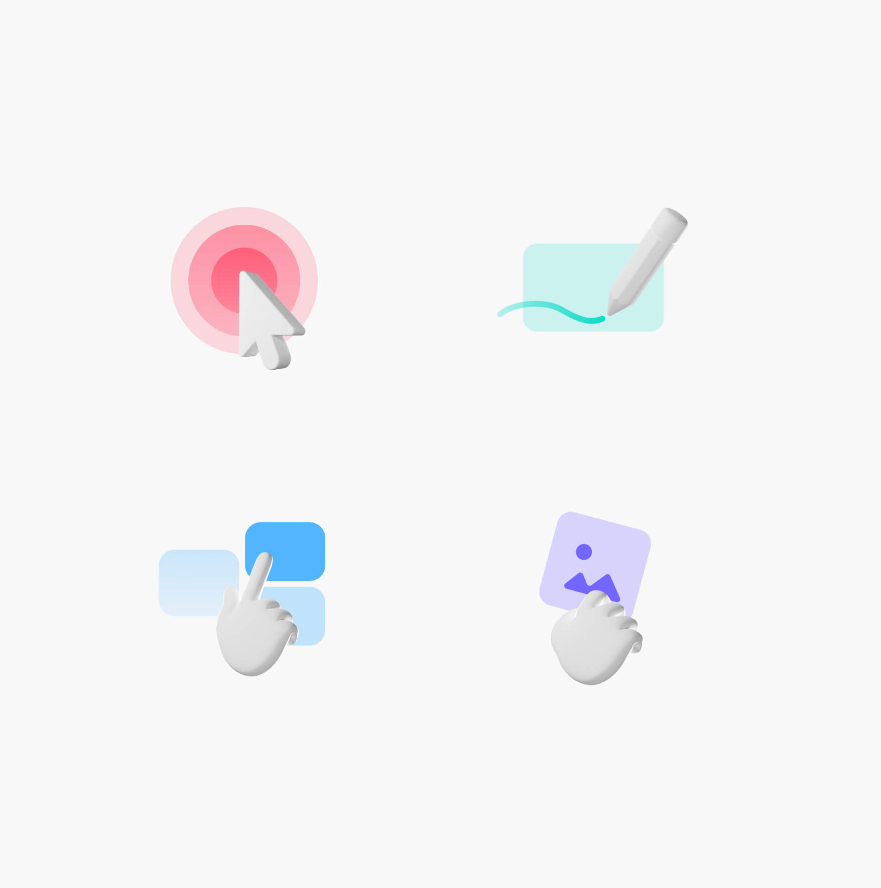 After exploring different concepts, we found that “emphasizing interaction” was not only a great theme for high impact visuals, but a way to visualise the cause and effect of the “buyer” and “seller” relationship. After creating some primitive explorations in Blender, I worked with the team to create a series of oversized cursors, and visual patterns for how they interacted with the page. These struck a balance between being accessible, but not cartoonish.