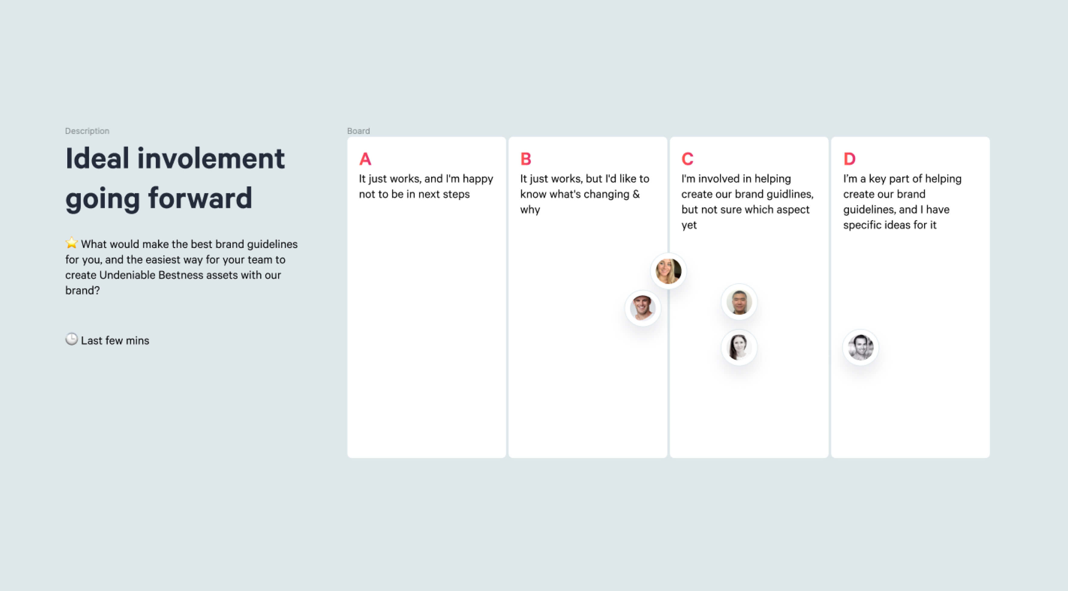 Three key themes emerged early on in discussions. How could the brand be easier to use? How could it have a clearer point of view in the market? How can the brand be more empowering than policing? To co-design the outcome to these questions, I brought in key perspectives through a series of workshops. Helping create a shared understanding of what we all wanted, and really needed, to focus on with our limited resources.