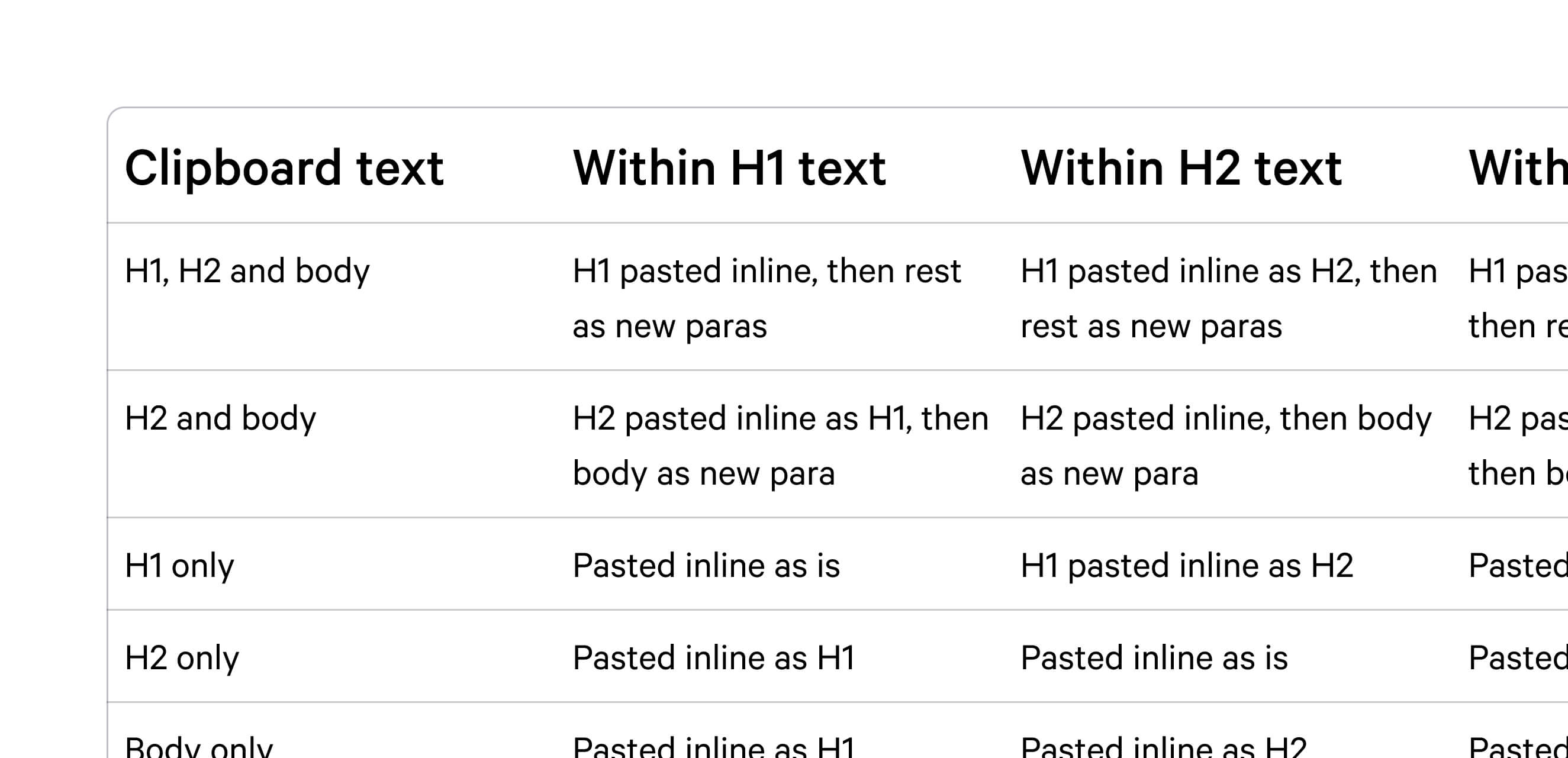 Guiding principles in place, I set off researching the minutiae of how the best editors worked. How they handled formatted text from the clipboard, keyboard shortcuts, re-ordering content, and more. Making note of what felt smooth in use, what felt rough, and comparing this to how the existing editor behaved.