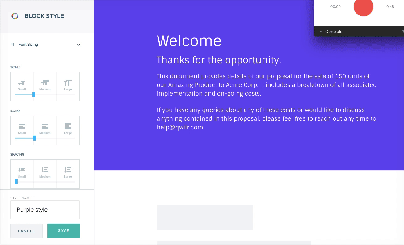 Qwilr pages are made up of sections called “blocks”, which had unique functionality (e.g. a “block” for quoting, a “block” for embeds). Style presets for these blocks were created from simple brand settings of the account; primary colour, secondary colour, and brand fonts. As most Qwilr customers have little to no design literacy, the goal is to enable good design outcomes, with minimal effort or thinking by the user.