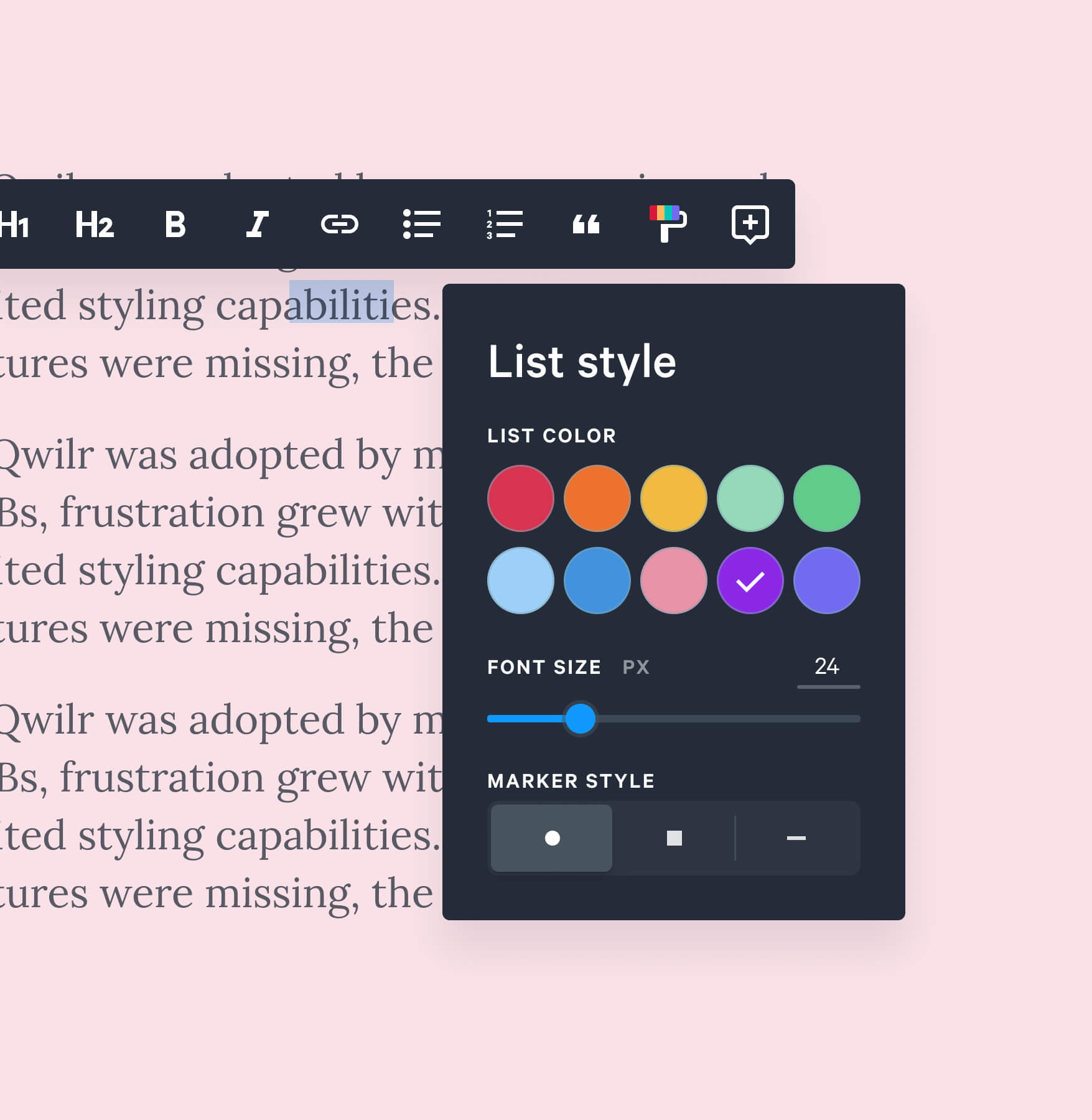 As Qwilr moved upmarket, 35% accounts were churning because of limited styling features. We’d fallen behind competitors, and needed to take a big swing to reduce the churn. I lead the team through a full feature redesign (twice), to turn styles from a major churn contributor, to a core competitive strength.