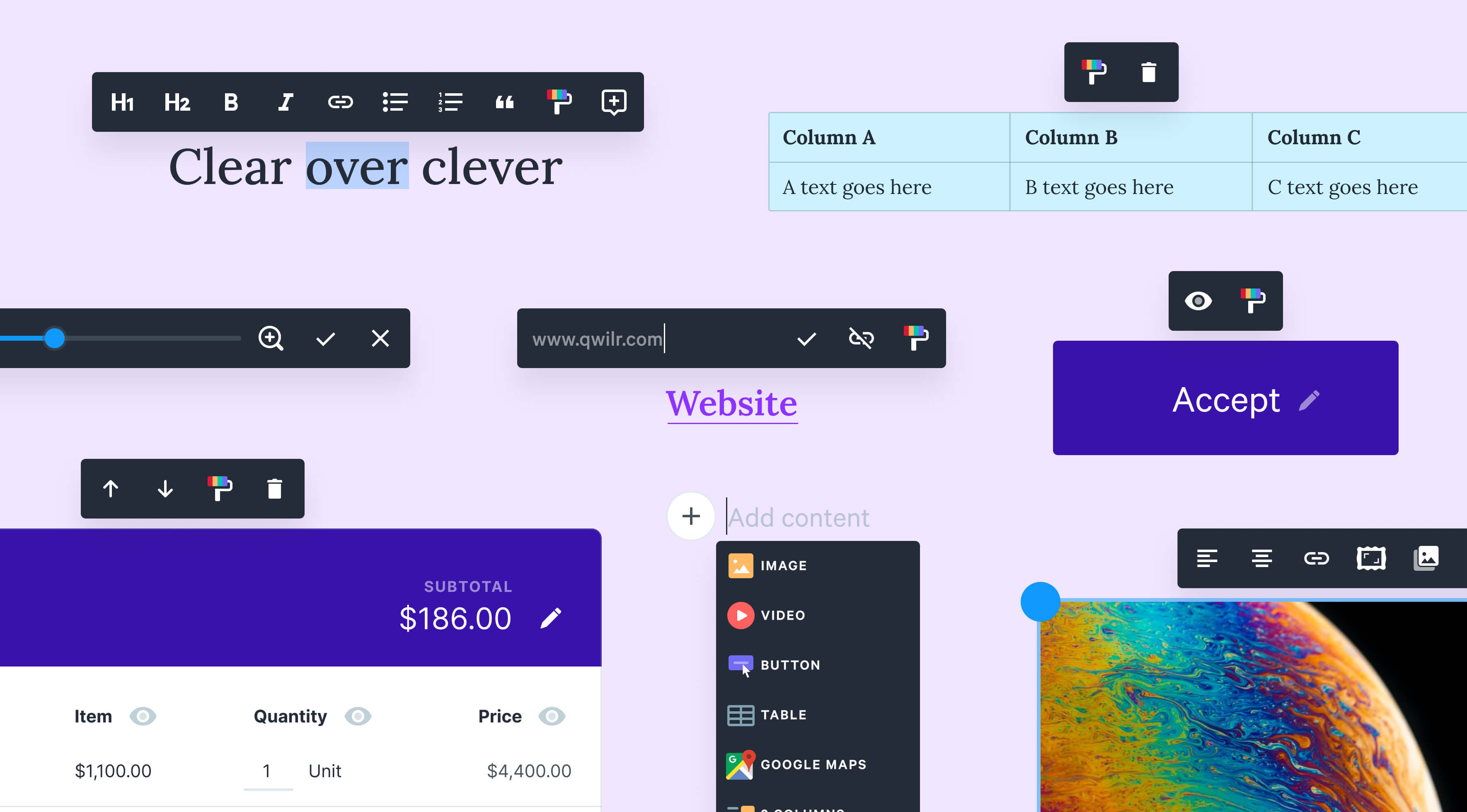 In the old editor, each element had a different ways to select, resize, restyle and even delete — a problem compounded by visually inconsistent controls. I wanted to make working with any element in the editor more discoverable, simpler, and more consistent. I redesigned all controls to have a sharper focus on accessibility, and designed them in a way that could scale with our upcoming feature. The first building blocks of Kaleidoscope, Qwilr’s Design System.