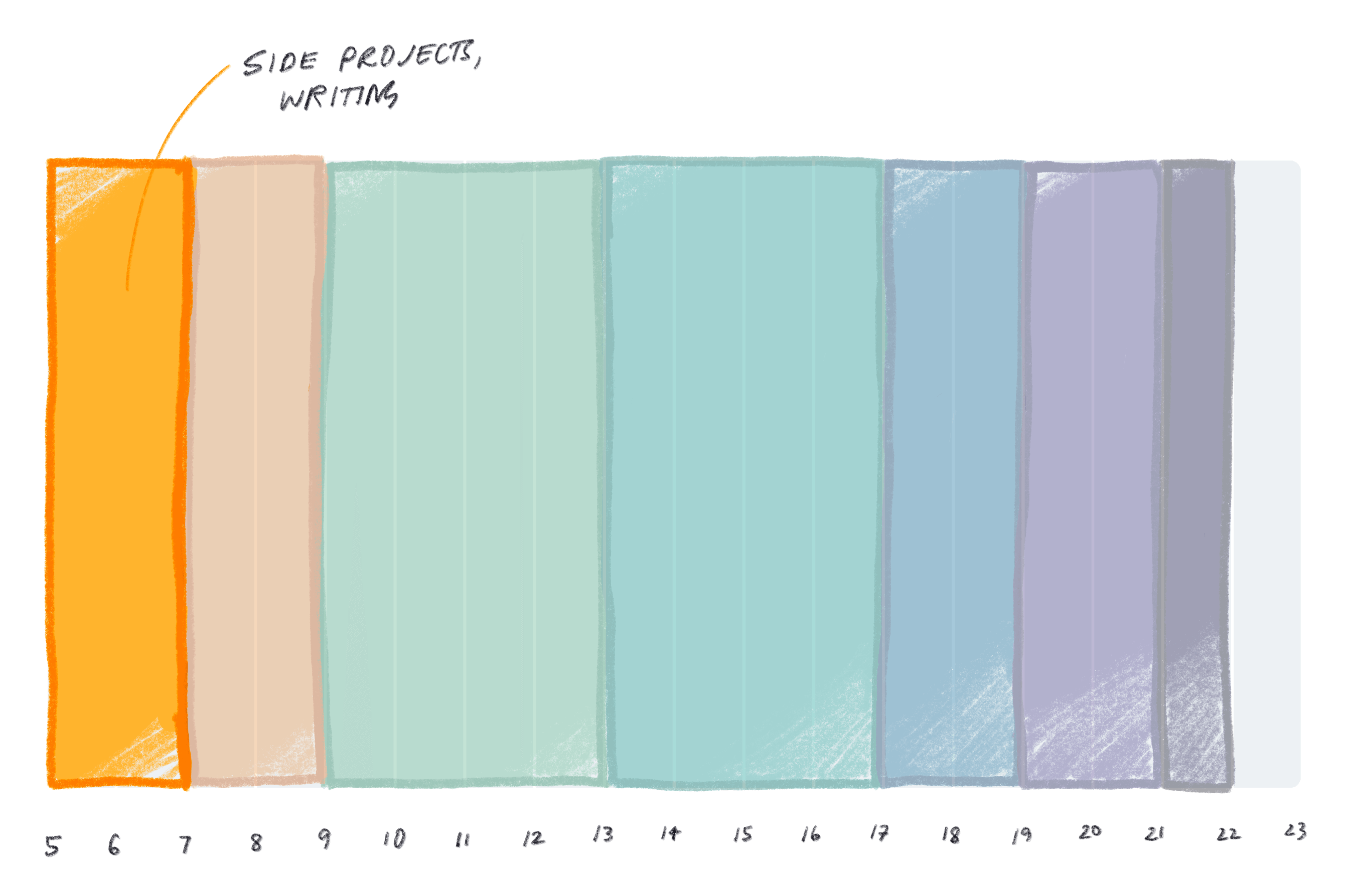 Again this isn’t perfect. Am I thinking and writing with perfect clarity at 5:06? Deeeeeefinitely not. For writing and side projects, these two hours are more than the energy and focus I have in the four after dinner. Like the “hour of sleep before midnight is worth two after”, but in reverse. Selfishly, spending time on myself first makes it much easier to focus and be present in the other spaces in my day.