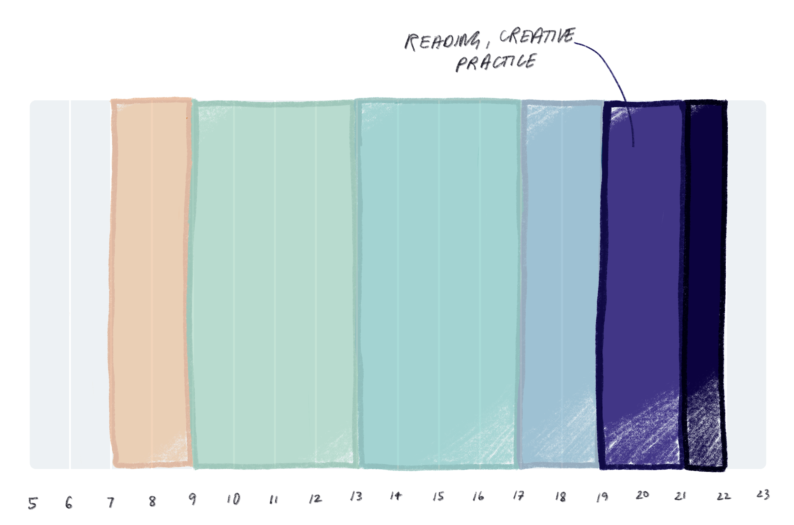 Looking at my days, after a good night’s sleep and other hard commitments, I have about 4 hours free a day. This all falls into one space after dinner, divvied up between work and Netflix. This isn’t my prime time brain time, but is a great home for “make space for” things like reading and creative practice.
