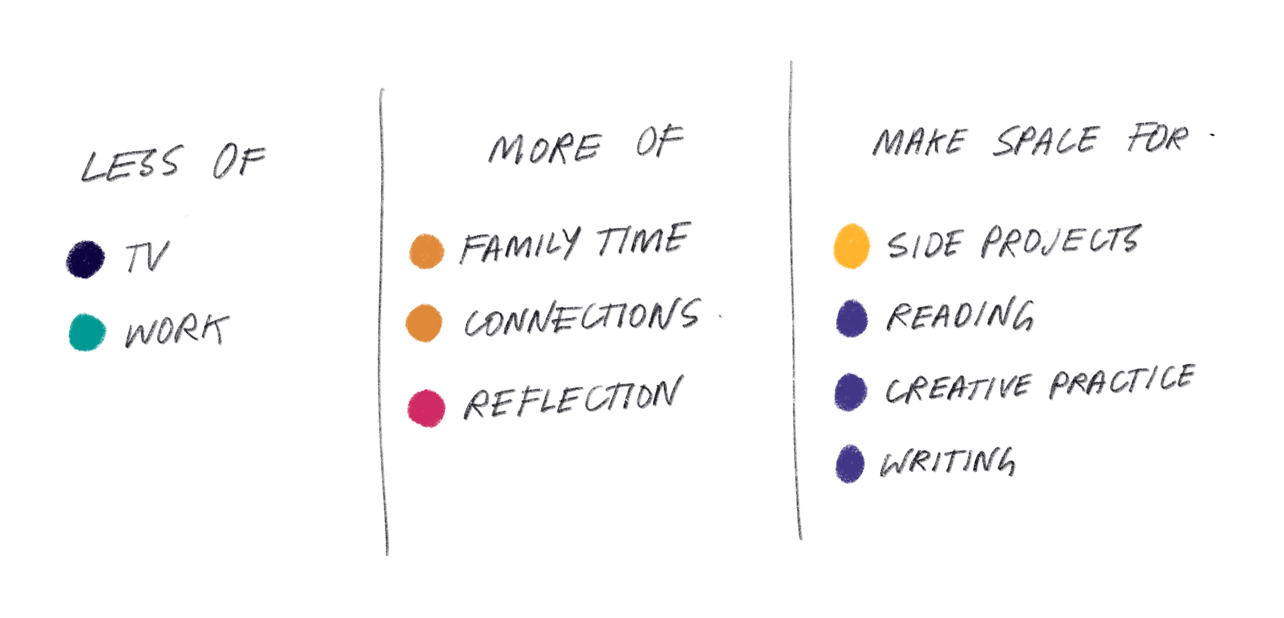 So, I could work less (which would have made for an even shorter post), but this is only part of the problem. Working is a default state when I’ve got nothing to displace it, but the white noise work weeks is also a reminder of all the things I’m not doing. I want my weeks to have rhythm and variety, that help create months with balance and fulfilment. Easy and enjoyable things to aim for, but to help be more specific I sketched out a goal of sorts. Things I want to be doing less of, things I want to do more of, and things I need to make space for. All to set a new, more fulfilling balance.